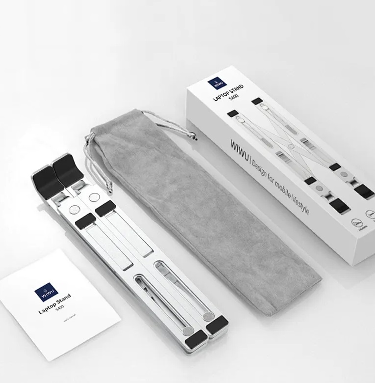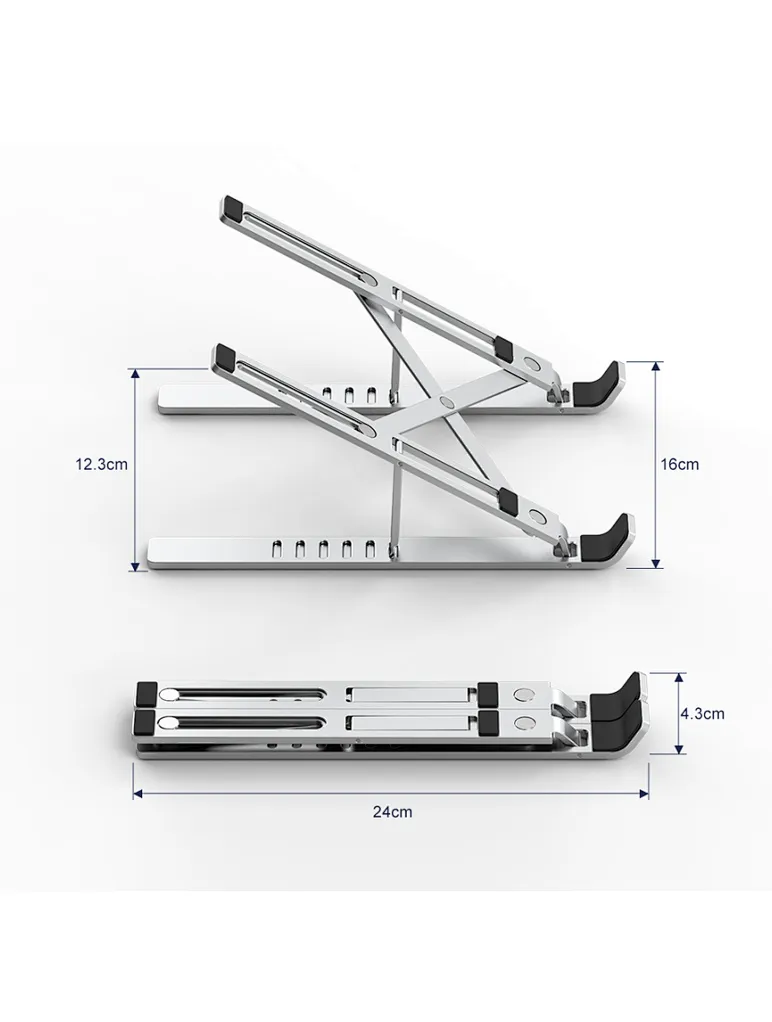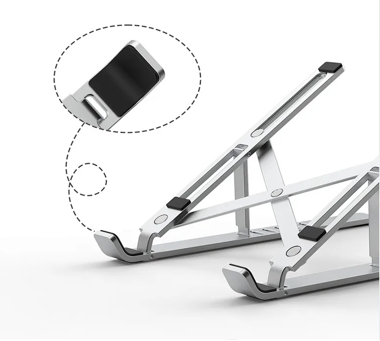 - Ventilación y refrigeración: Material de aluminio como disipador de calor. El diseño abierto en la parte inferior de los soportes para computadora portátil mejora el flujo de aire para evitar que su computadora portátil se sobrecaliente.